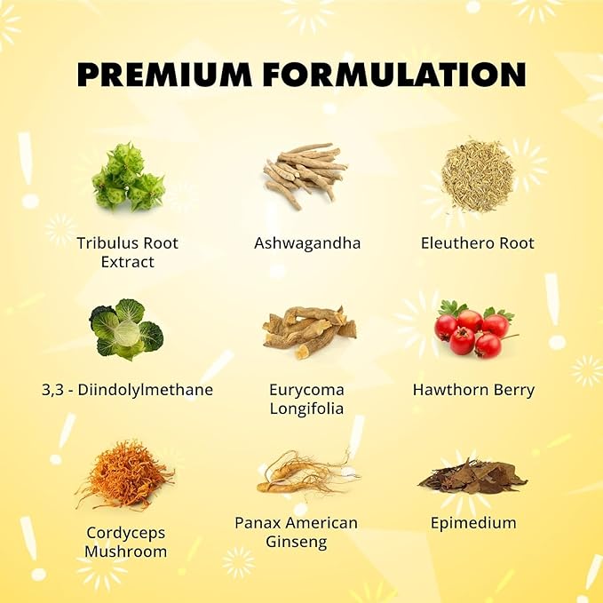 - Natural Formula for Men: Our testosterone booster is packed with Ashwagandha (KSM-66), Tribulus extract, American Ginseng Root, and other extracts to help support gains, energy and stamina.*